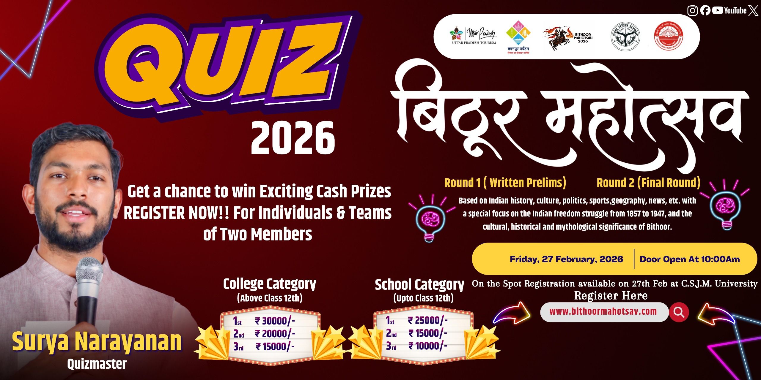शहर की ऐतिहासिक और सांस्कृतिक विरासत को सहेजने के उद्देश्य से आयोजित होने वाले ‘बिठूर महोत्सव 2026’ के तहत आगामी 27 फरवरी को एक भव्य क्विज प्रतियोगिता का आयोजन किया जा रहा है। सी.एस.जे.एम. विश्वविद्यालय के परिसर में आयोजित होने वाली इस प्रतियोगिता में कानपुर के स्कूलों और कॉलेजों के छात्र अपनी प्रतिभा का प्रदर्शन करेंगे। क्विजमास्टर सूर्या नारायणन के साथ इस बौद्धिक महाकुंभ का हिस्सा बनें।