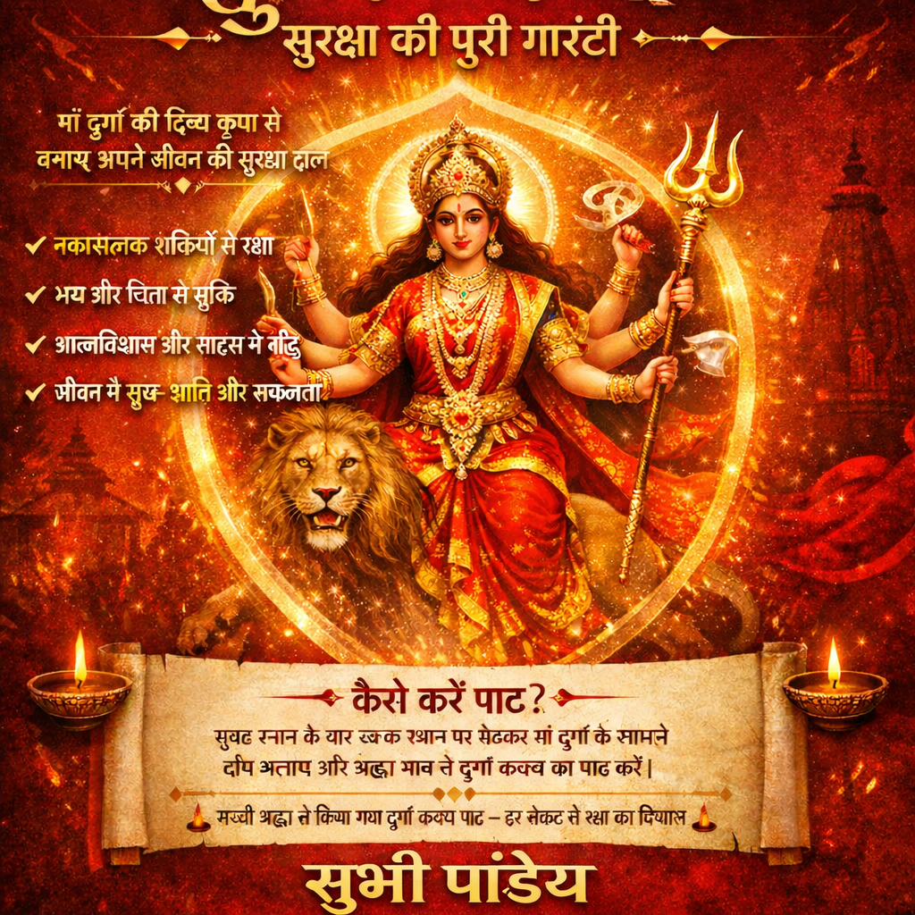 दुर्गा कवच को देवी दुर्गा की दिव्य कृपा का शक्तिशाली स्तोत्र माना जाता है। मान्यता है कि जो व्यक्ति श्रद्धा और विश्वास के साथ दुर्गा कवच का पाठ करता है, उसके चारों ओर देवी की अदृश्य सुरक्षा ढाल बन जाती है। यह कवच न केवल नकारात्मक शक्तियों और भय से रक्षा करता है, बल्कि जीवन में साहस, आत्मविश्वास और सकारात्मक ऊर्जा भी भरता है।